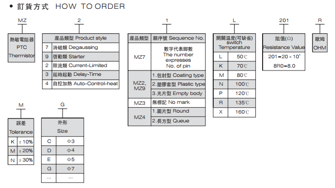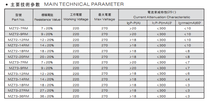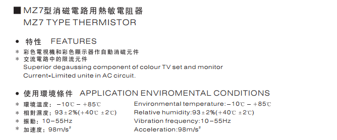 PTC熱敏電阻器:是一種以鈦酸鋇為主要成分的半導(dǎo)體陶瓷元件,當(dāng)溫度增加到居里溫度以上時,其電阻值呈階躍式增加,可達(dá)到4~10個數(shù)量級。它具有電阻值隨溫度的增加而增加的特性。其中MZ2型熱敏電阻器由于過流保護(hù)作用而用于通訊及交流電路中。MZ3型熱敏電阻器具有延長燈絲壽命及節(jié)約能源而用于電子節(jié)能燈及電子鎮(zhèn)流器,用于數(shù)字式萬用表中作過流保護(hù)元件、交流電路中過熱保護(hù)。MZ9型馬達(dá)啟動熱敏電阻器可作為無觸點(diǎn)開關(guān)用于制冷設(shè)備的壓縮機(jī)及大功率馬達(dá)中。MZ7型消磁電路用熱敏電阻器,在彩色電視機(jī)和彩色顯示器作自動消磁元件,