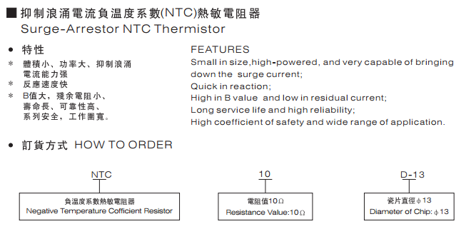 NTC熱敏電阻器:是以錳、鈷、鎳和銅等金屬氧化物為主要材料,采用陶瓷工藝制造而成的。NTC熱敏電阻器在室溫下的變化范圍在10°歐姆~10⒍歐姆,溫度系數-2%~-6.5%。它具有電阻值隨溫度的上升而下降的特性。適用于轉換電源、開關電源、UPS電源、各類電加熱器、電子節能燈、電子鎮流器、各種電子裝置電源電路的保護以及彩色顯示管、白熾燈及其他照明燈具的燈絲保護。