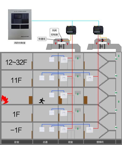 在消防行業(yè),一般是通過余壓探測器來時(shí)刻監(jiān)控樓梯間與前室之間的氣壓差,根據(jù)差值大小來控制風(fēng)機(jī)給樓梯間或前室的送風(fēng)量,使樓梯間的氣壓始終高出前室氣壓一定范圍內(nèi)。阻止煙霧擴(kuò)散,順利打開逃生門,且在逃生過程中遲可能不因過多煙霧吸入,保護(hù)人員安全;