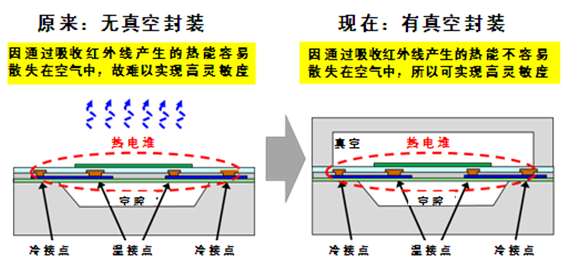 這次,世界首次成功將熱電堆真空封裝在芯片內。采用真空封裝即可避免將熱電堆轉換的熱能散失在空氣中,使金屬接點之間的溫差變大,從而可實現更高的靈敏度。