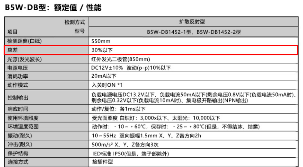 反射型光電傳感器上的動(dòng)作距離是指使檢測(cè)物體接近傳感器時(shí)切換為ON的距離。此外,使檢測(cè)物體離開(kāi)該范圍并切換為OFF的距離稱(chēng)為復(fù)位距離。這個(gè)動(dòng)作距離與復(fù)位距離之差稱(chēng)為“應(yīng)差距離”(參考見(jiàn)下圖)。如果無(wú)應(yīng)差,則會(huì)在動(dòng)作區(qū)域附近出現(xiàn)反復(fù)切換ON/OFF的現(xiàn)象(震顫)。為了防止這種現(xiàn)象的發(fā)生,需要設(shè)定應(yīng)差。B5W-DB型的應(yīng)差規(guī)定在30%以下。例如,某單體以800mm的距離切換為ON時(shí),表示復(fù)位距離為800 mm X 1.3 =1,040 mm以下。