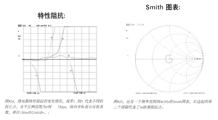 如果您需要觀察不同的RF頻率或者一個特定頻率,Smith圖表可以呈現在一定頻率范圍內的特性抗阻的變化情況。Smith圖會以50KHz為單位一直描繪到4GHz的頻率反應情況。圖#25中繪制出的點是以純實部50歐姆為圓心分布的。為了更清楚理解Smith圖表,由右邊起點延伸過來的圓實際上就是50歐姆的阻抗圓,圓的水平中心線是實軸,位于這條中線之上呈現感性,而位于中線之下則呈現為容性。如圖所示,CRF繼電器的測量結果都位于50歐姆附近。