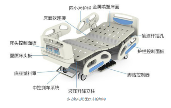 多功能電動醫療床由ABS床頭、ABS提升護欄、床板、上床架、下床架、升降連桿、電動推桿、控制器、手控板萬向輪等主要部件組成