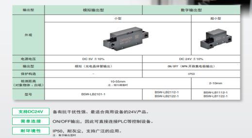 歐姆龍B5W系列限定反射型傳感器(如圖二)采用了收縮投光、受光側的光路直徑,以獲取物體表面的正反射光的光學設計。因此,照射到檢測物體上的光束密度高,易于檢測低反射率物體。