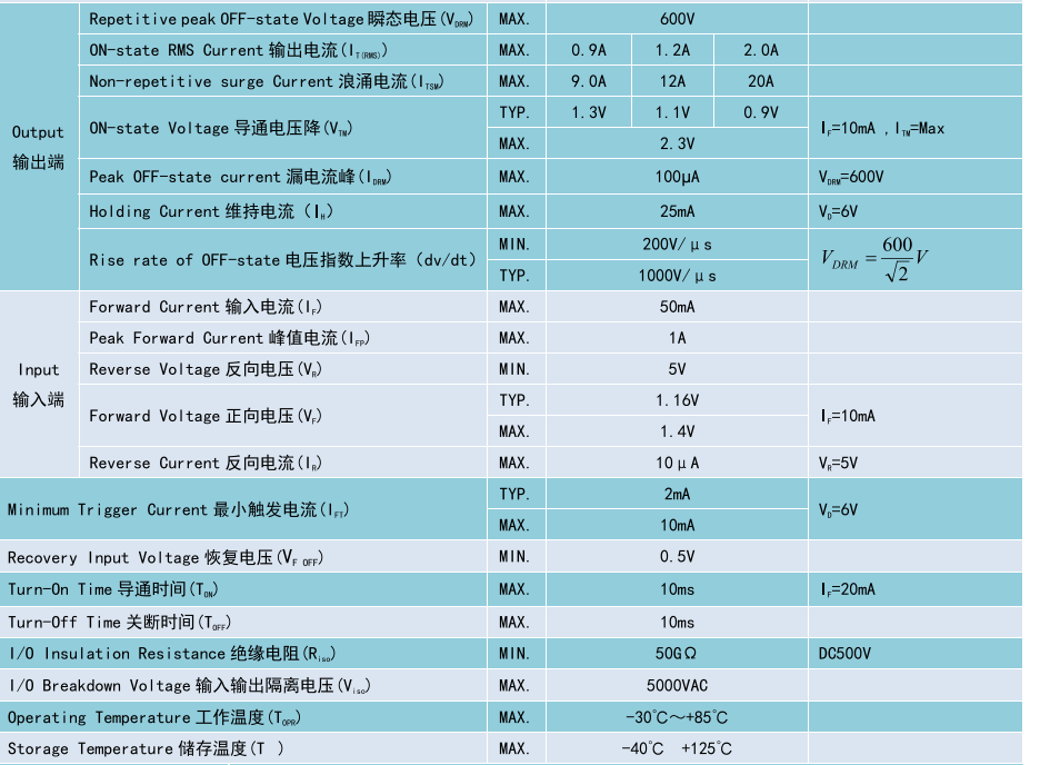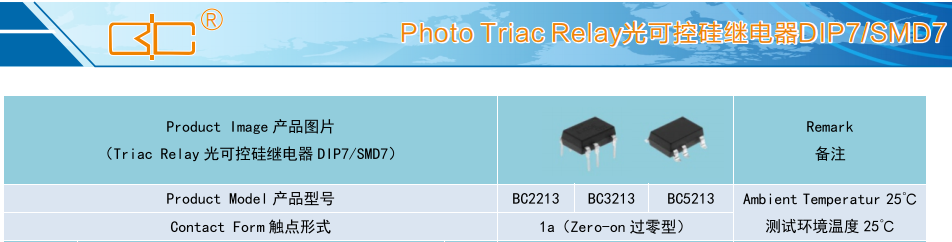(Triac Relay 光可控硅繼電器 DIP7/SMD7),Product Model產(chǎn)品型號(hào):BC2213/BC3213/BC5213,Contact Form觸點(diǎn)形式:1a(Zero-on 過(guò)零型),Ambient Temperatur 25'C,測(cè)試環(huán)境溫度 25℃℃