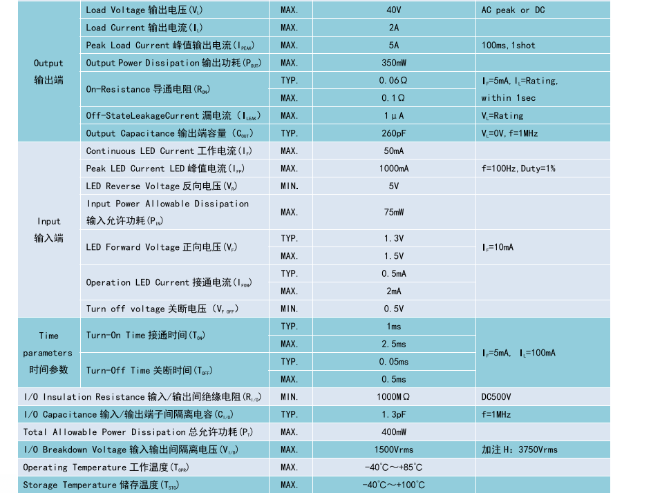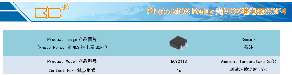 Relay 光MOS 繼電器 SOP4, Product Model產(chǎn)品型號:BCY211S, Contact Form觸點形式:1a, Ambient Temperature 25C, 測試環(huán)境溫度 25℃C