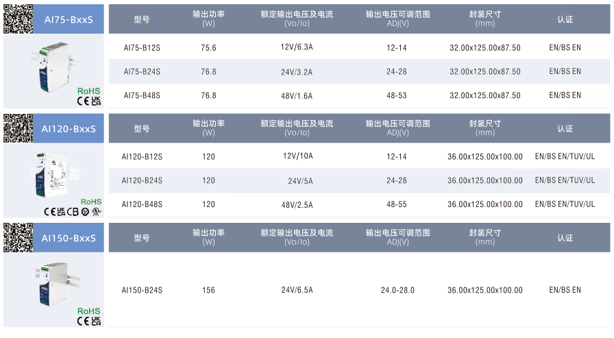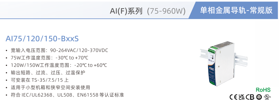 開關電源A175/120/150-BxxS, ?寬輸入電壓范圍:90-264VAC/120-370VDC ?75W工作溫度范圍:-30°Cto+70℃ ?120W/150W工作溫度范圍:-20°Cto+60°C ?輸出短路、過流、過壓、過溫保護 ?可安裝在 TS-35/7.5/15 上 ?適用于小型機箱和狹窄空間安裝使用 ?符合IEC/UL62368、UL508、EN61558等認證標準