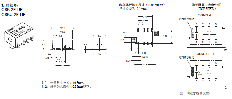 | 單穩型 | 塑料密封型 | DPDT(2c) | DC 3, 4.5, 5, 12, 24 | G6K-2P-RF | 30件/根 |