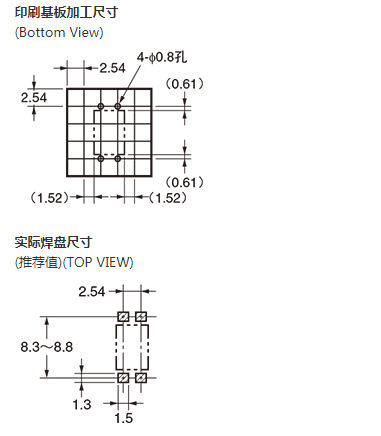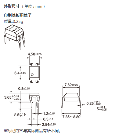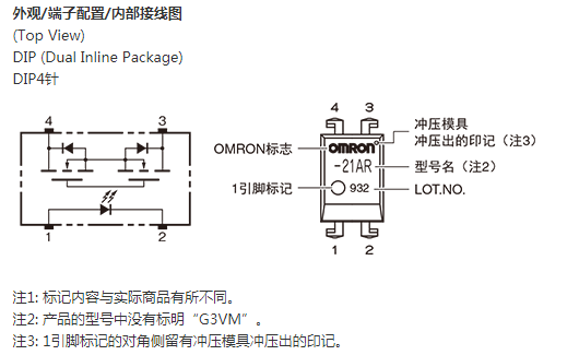 * 連續負載電流 (最大)、 負載電壓 (最大) : 表示峰值AC、 DC。 注1. 帶狀包裝(表面安裝端子型) 無標準在庫機種。 注2. 帶狀包裝(表面安裝端子型) 的訂貨請在型號末尾加上(TR) 或(TR05)。 |