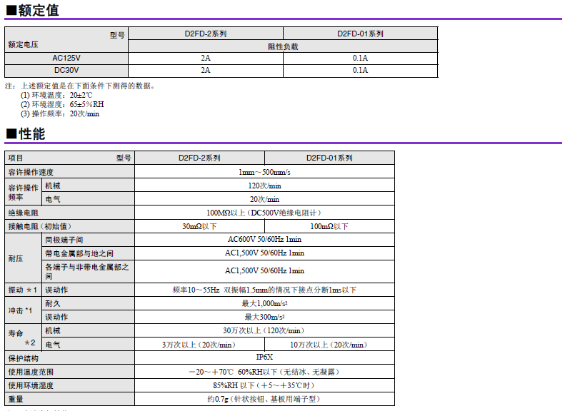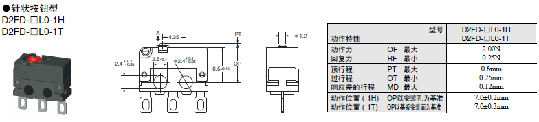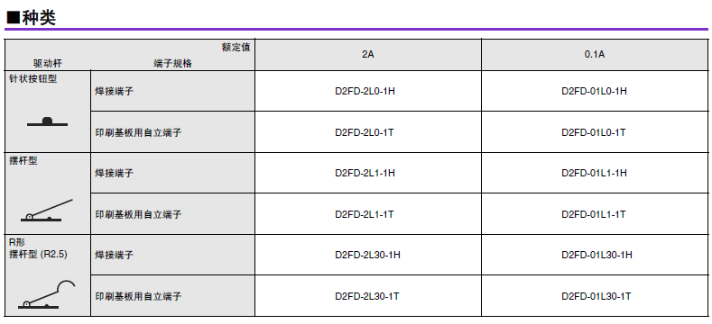 D2FD-2 超級小型基本開關 兼具防塵功能的極超小型基本開關 利用橡膠封裝的密封結構實現防塵 (IEC IP6X)??稍谟谢覊m、紙粉的環境下使用。 可動片為1片彈簧構造,支持AC125V 2A開關,更有微小負載型可供選擇。 還備有焊接、印刷基板用端子。