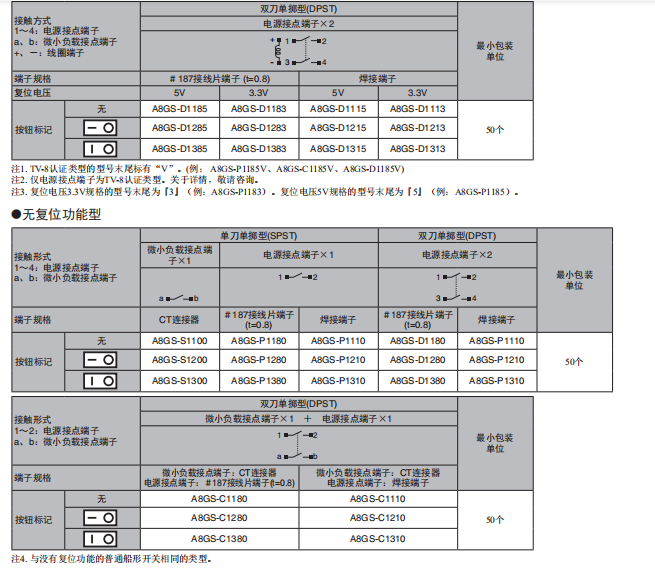A8GS 遠(yuǎn)程復(fù)位 船形開關(guān) 帶復(fù)位功能船形開關(guān) 利用基于外部信號的 “復(fù)位功能”關(guān)閉電源開關(guān),設(shè)備的待機功率為零。 適用于浪涌較大的負(fù)載的電源ON/OFF。適用于TV-8(浪涌特性117A)。 備有適用于微小負(fù)載領(lǐng)域的接點構(gòu)造種類。 備有可同時ON/OFF微小負(fù)載領(lǐng)域、高負(fù)載領(lǐng)域的2極規(guī)格種類。 接點間隙大于3mm。 取得UL、cUL標(biāo)準(zhǔn)認(rèn)證,并符合EN標(biāo)準(zhǔn)。