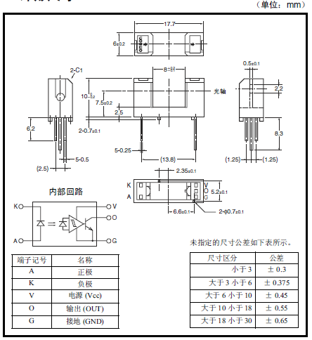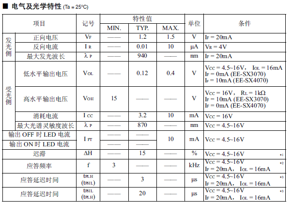 光電IC輸出型微型光電傳感器[透過型] 受光元件與增幅回路內(nèi)置于一個芯片 受光元件中內(nèi)置有溫度補償回路 適用電源電壓為DC4.5 ~ 16V 可直接連接C-MOS、TTL 高分辨率(狹片寬度 0.5mm) 遮光時ON型:EE-SX3070