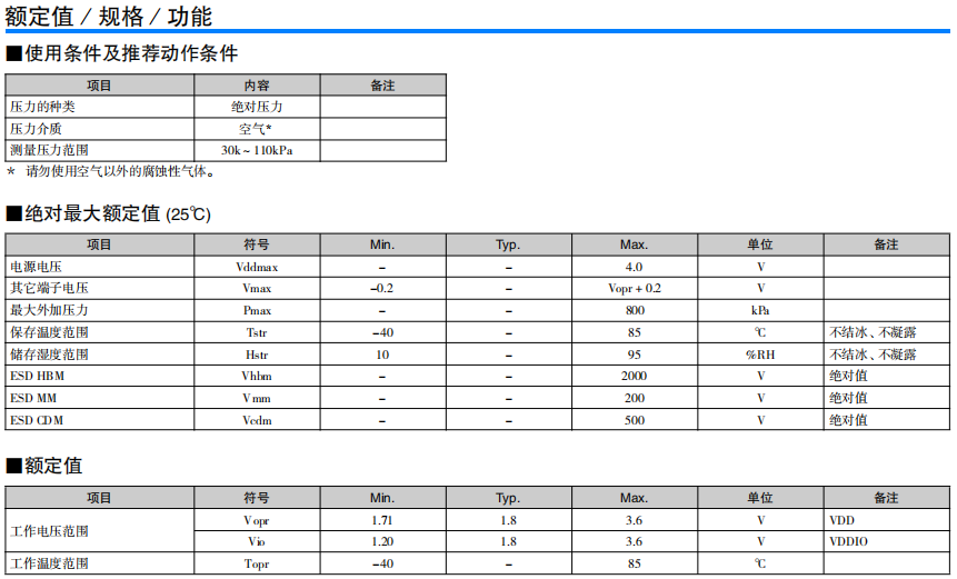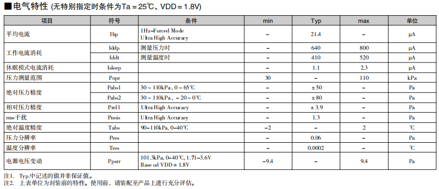 高精度·低消耗電流的小型MEMS絕對(duì)壓力傳感器 高精度地測(cè)量氣壓 內(nèi)置低干擾的24bit ADC 基于I2C/SPI 接口的數(shù)字控制/輸出 在自動(dòng)睡眠模式下實(shí)現(xiàn)低消耗電流 單獨(dú)的補(bǔ)償系數(shù)保存在OTP*中 (* One Time Programmable - ROM)