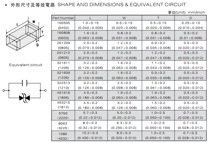 特征: 1、疊層片式陶瓷結(jié)構(gòu)。 2、無(wú)引線。 3、溫度范圍:-55℃~+125 ℃。 4、工作電壓范圍V w(dc)=3.3~ 615V。 5、具有雙向限制特性,適合ESD保護(hù)。 6、漏電流非常小。 7、寄生電感小、響應(yīng)速度快(響應(yīng)時(shí)間少于0.5ns)。 8、優(yōu)良的溫度系數(shù)。 9、良好的焊接性能(端電極為三層電鍍)。 應(yīng)用: 1、防止過(guò)電壓:當(dāng)施加的電壓升高到壓敏電壓時(shí),壓敏電阻器的電流急劇上升,被保護(hù)設(shè)備的浪涌電壓迅速減小,從而使裝有壓敏電阻器的設(shè)備抗浪涌噪聲能力達(dá)到相應(yīng)要求。
