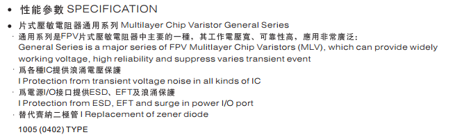 特征: 1、疊層片式陶瓷結構。 2、無引線。 3、溫度范圍:-55℃~+125 ℃。 4、工作電壓范圍V w(dc)=3.3~ 615V。 5、具有雙向限制特性,適合ESD保護。 6、漏電流非常小。 7、寄生電感小、響應速度快(響應時間少于0.5ns)。 8、優良的溫度系數。 9、良好的焊接性能(端電極為三層電鍍)。 應用: 1、防止過電壓:當施加的電壓升高到壓敏電壓時,壓敏電阻器的電流急劇上升,被保護設備的浪涌電壓迅速減小,從而使裝有壓敏電阻器的設備抗浪涌噪聲能力達到相應要求。